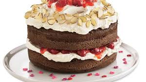 Place the cake on a work surface with its original top up. Trim off any hard crusts. With a long serrated knife, cut the cake horizontally into 3 even layers. Transfer the top layer to a serving plate, arranging it top side down. Brush it liberally with the syrup. With an offset spatula or rubber spatula, smooth on a 1/2-inch layer of whipped cream. Push the cream a little beyond the edge of the cake. (This prevents gaps when you settle the next layer on top.) Nestle half of the cherries into the whipped cream, scattering them evenly over the top.