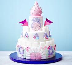 4 Place cake on 12- to 15-inch serving plate, tray or piece of cardboard covered with foil. Pipe pink icing around base of cake; place round candies in 3 rows around base in icing. Add round candies to top of castle as desired, attaching with icing.